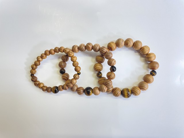 虎目石が仕立てられている屋久杉ブレスレットです。 8mmサイズ(内周16cm)、10mmサイズ(内周17cm)、12mmサイズ(内周18cm)があります。